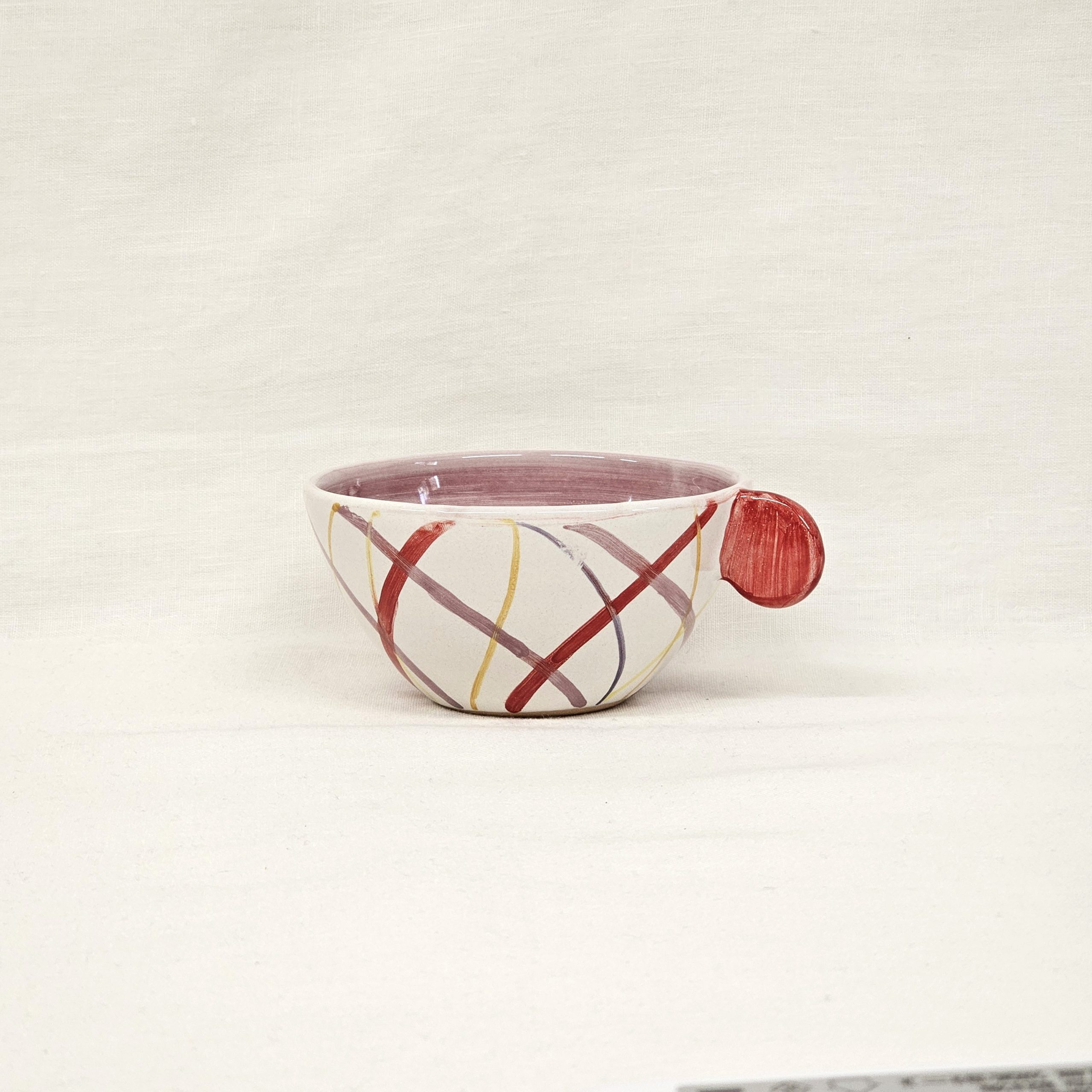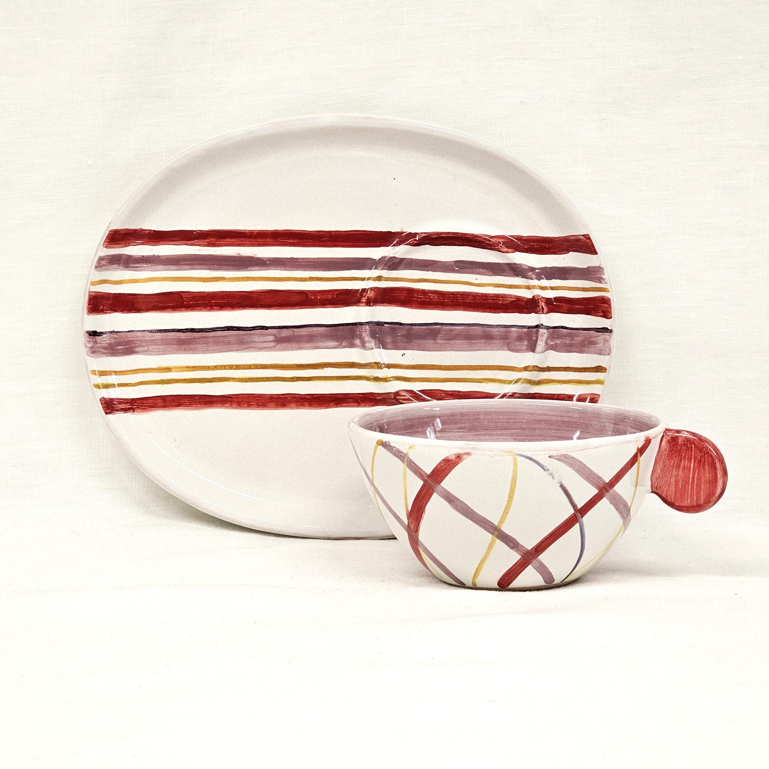 Tazza di di capacita di 200 ml con piatto ovale che può fungere da piccolo vassoio per i biscotti. Il set può essere utilizzato anche per servire una zuppa con pane tostato . Il vassoio ovale si può abbinare a ciotole di qualsiasi altra dimensione che pero abbiano il diametro inferiore pari all’alloggio creato nel piatto ovale. I colori della pittura sono azzurro, verde e blu su smalto avorio. L’interno della tazza è pennellato in verde.