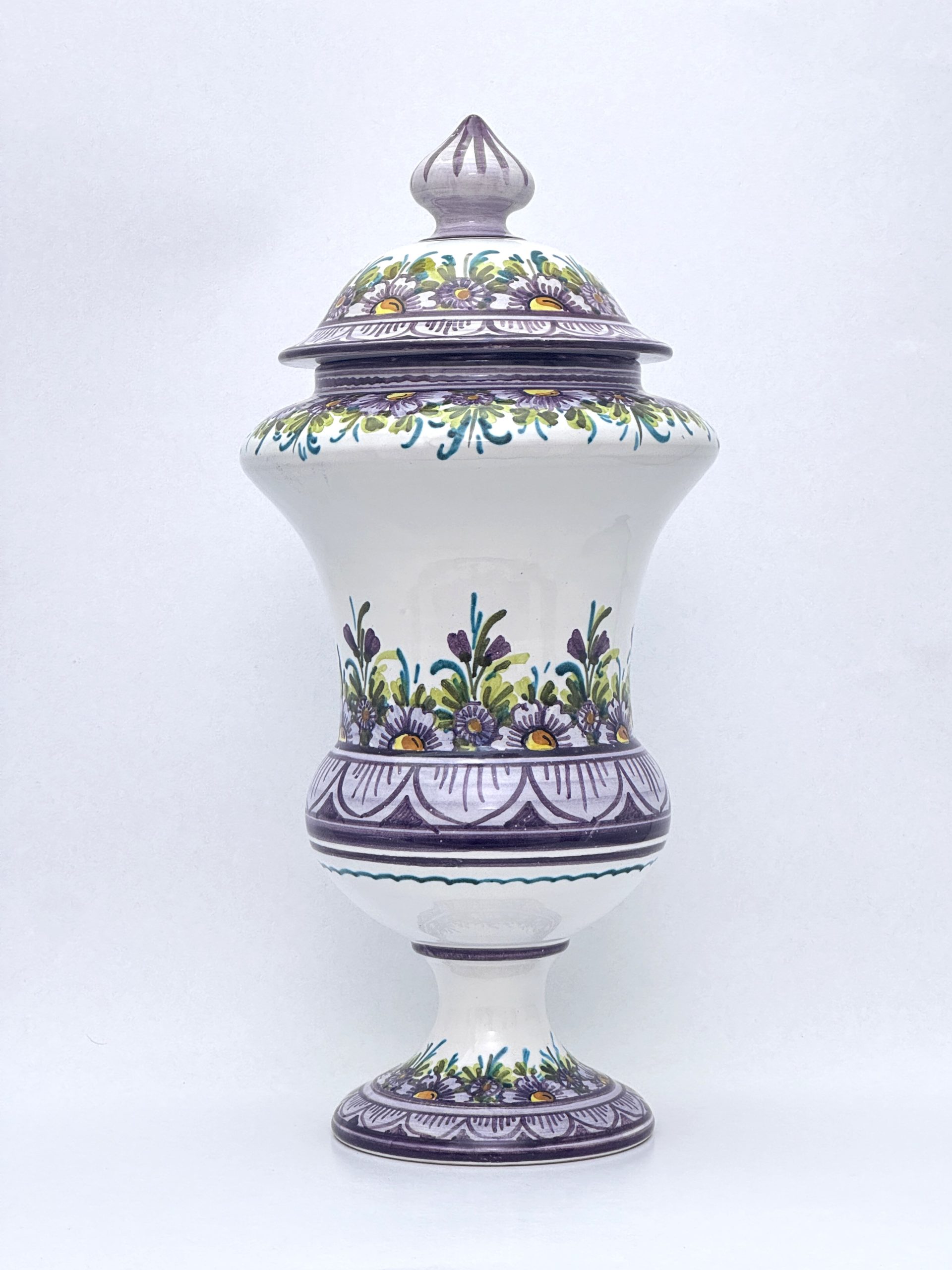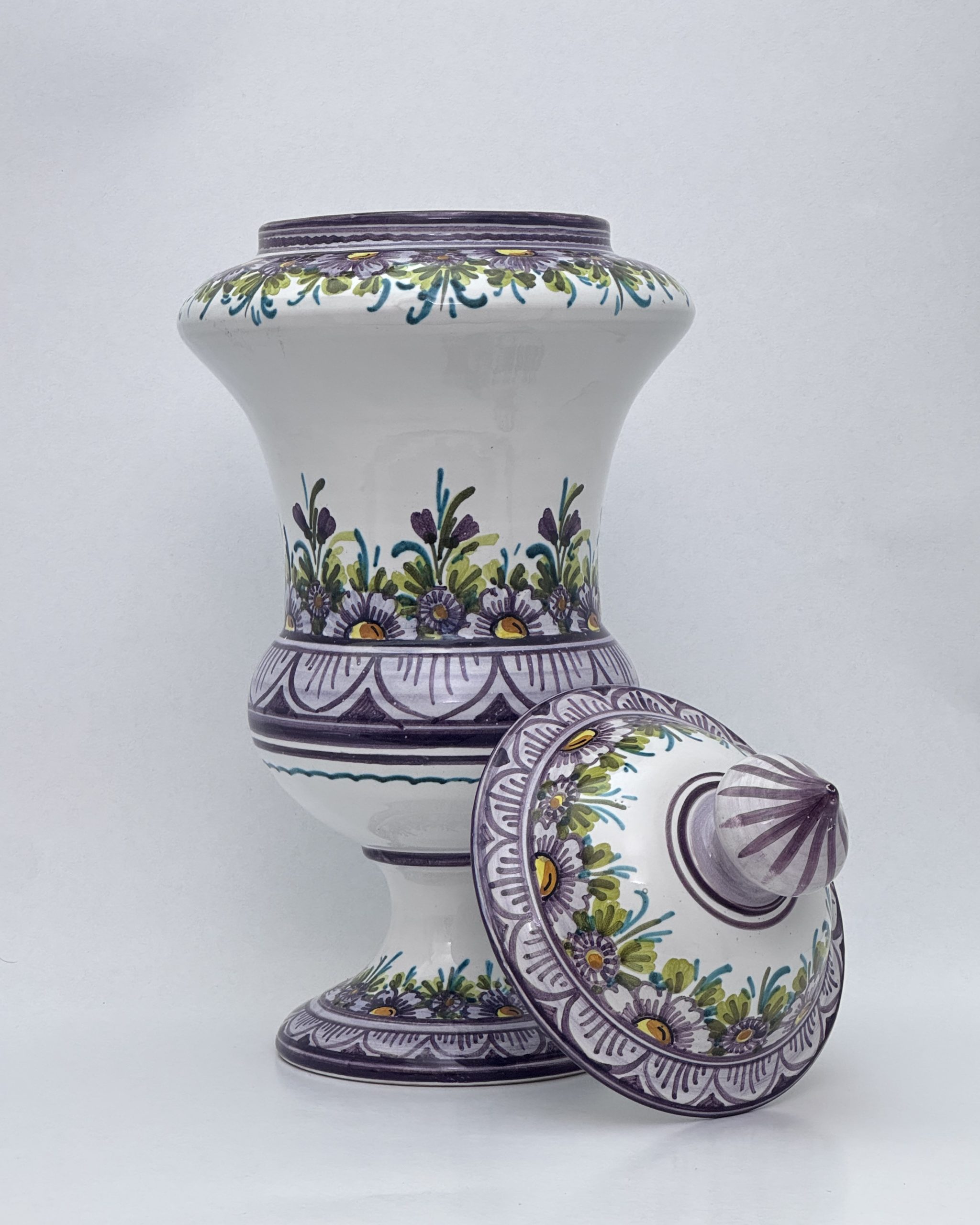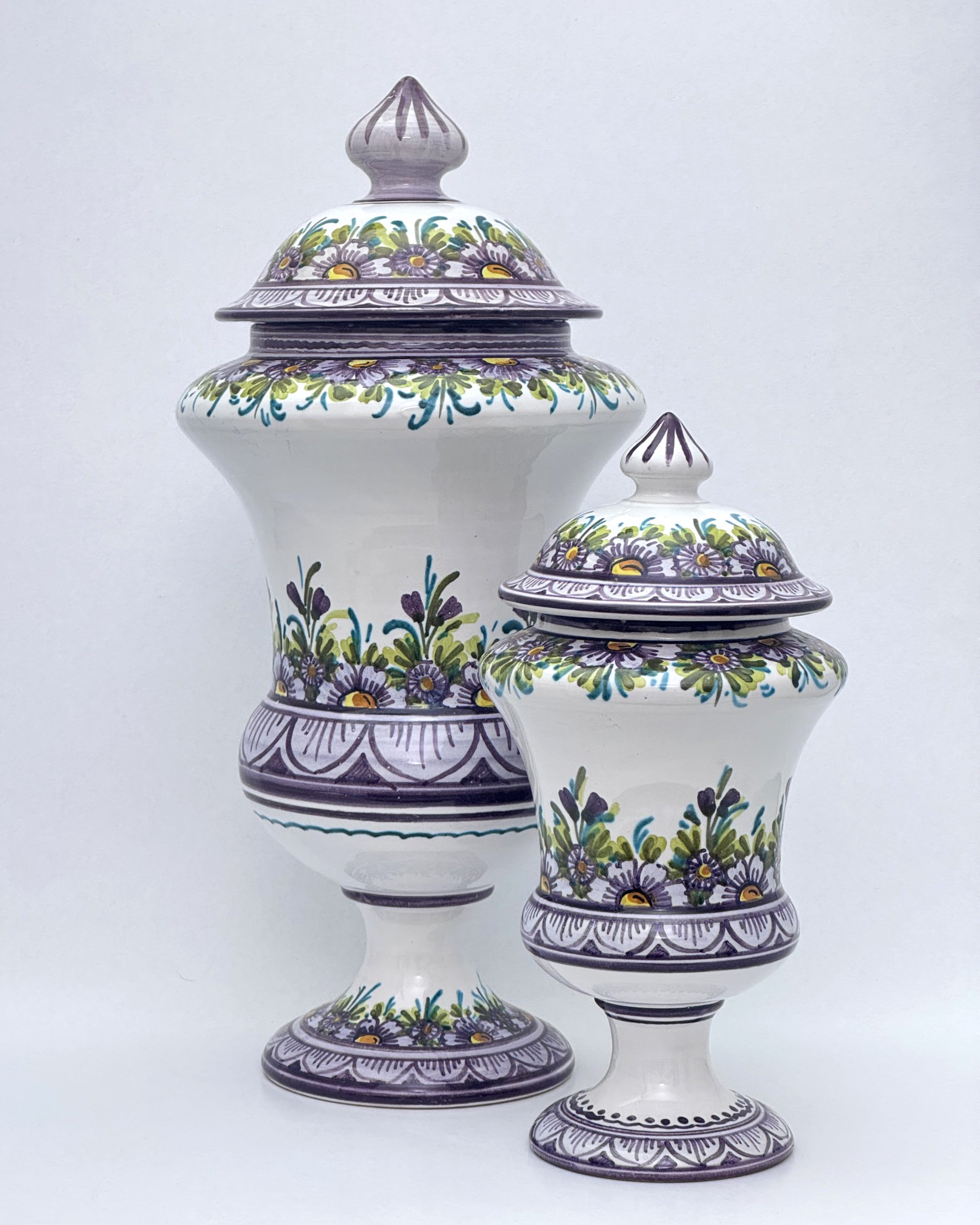Il vaso dalla forma sinuosa  foggiato a mano riprende le linee degli antichi vasi per le spezie dei farmacisti. La decorazione accurata sulla superficie curva rende l’oggetto speciale.