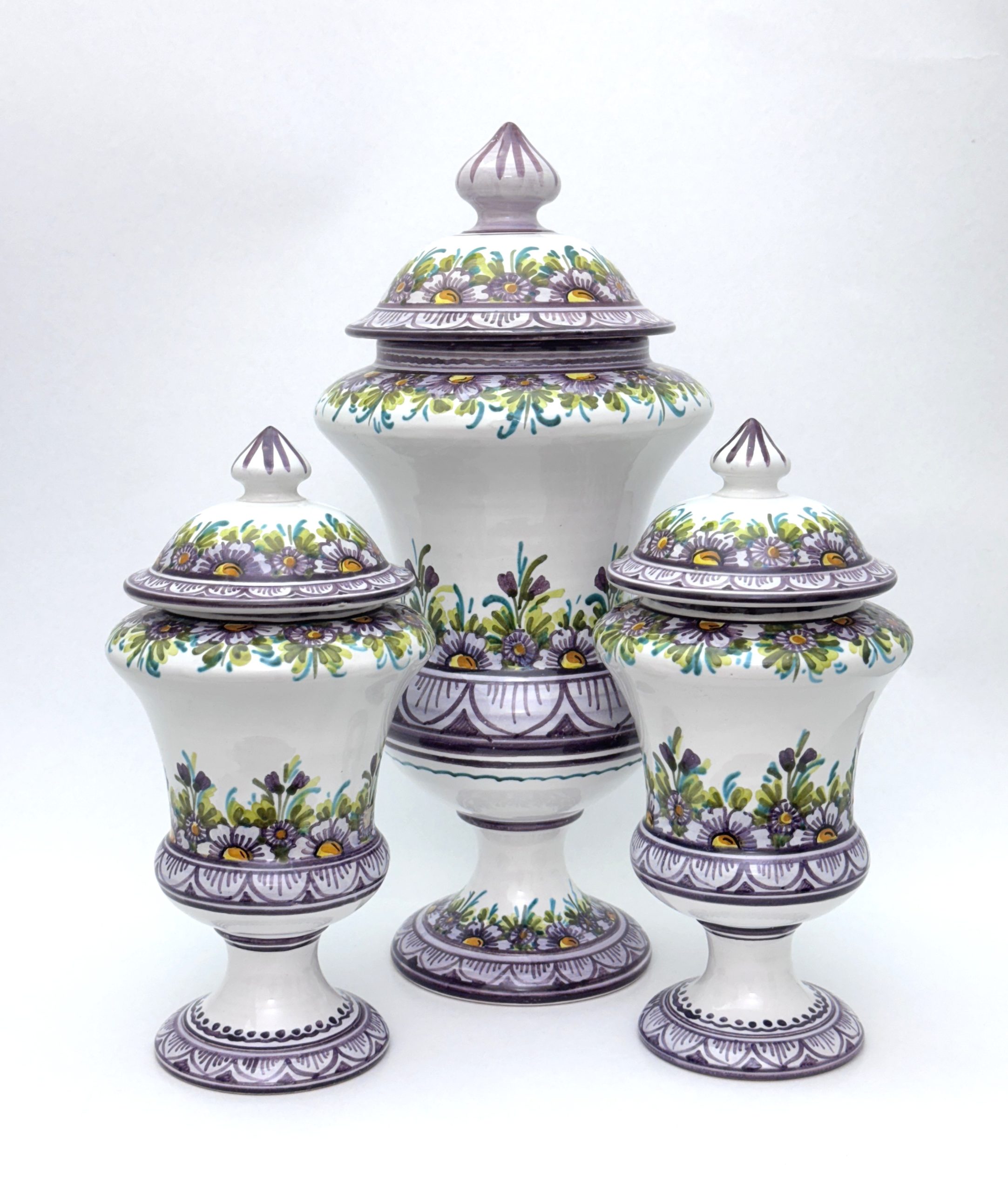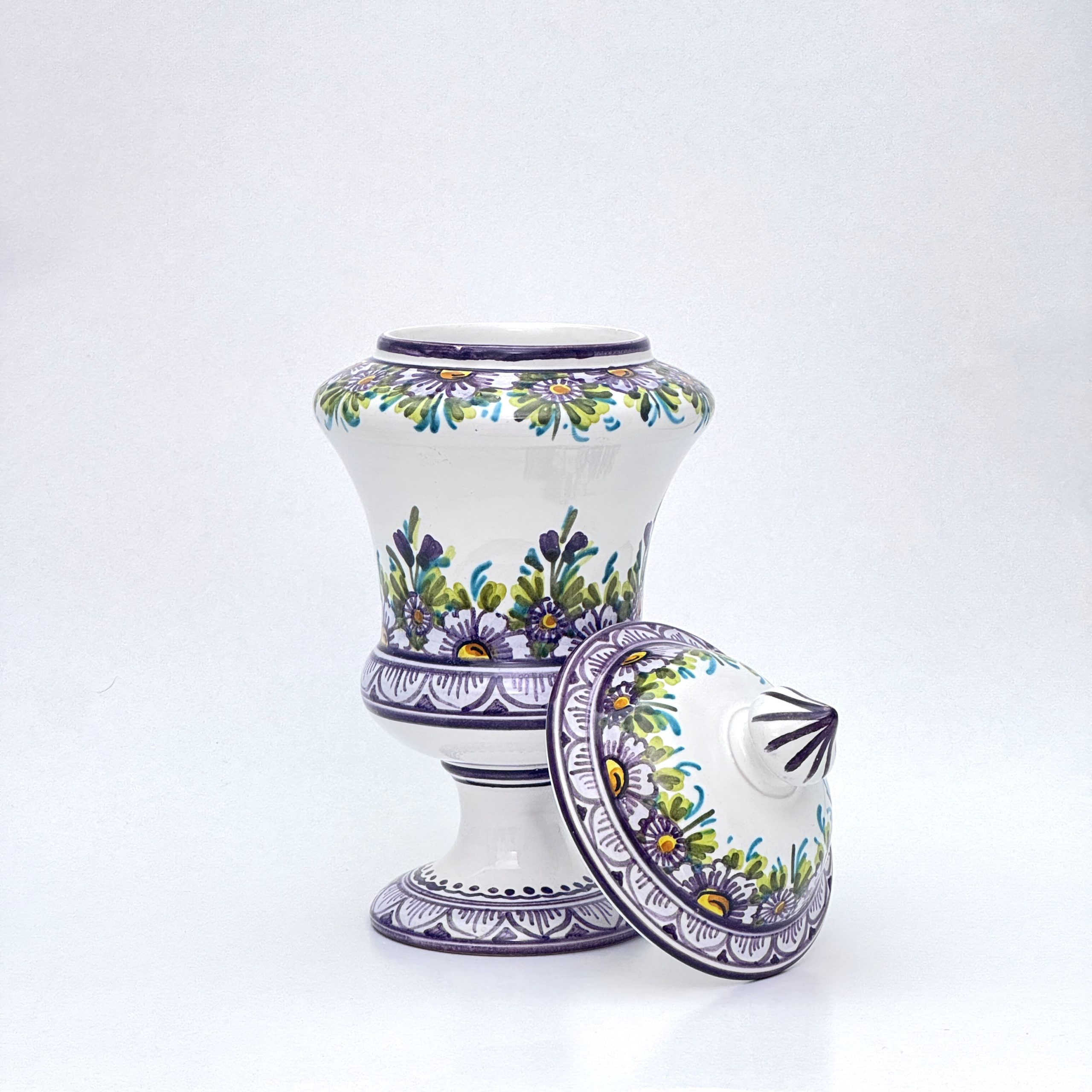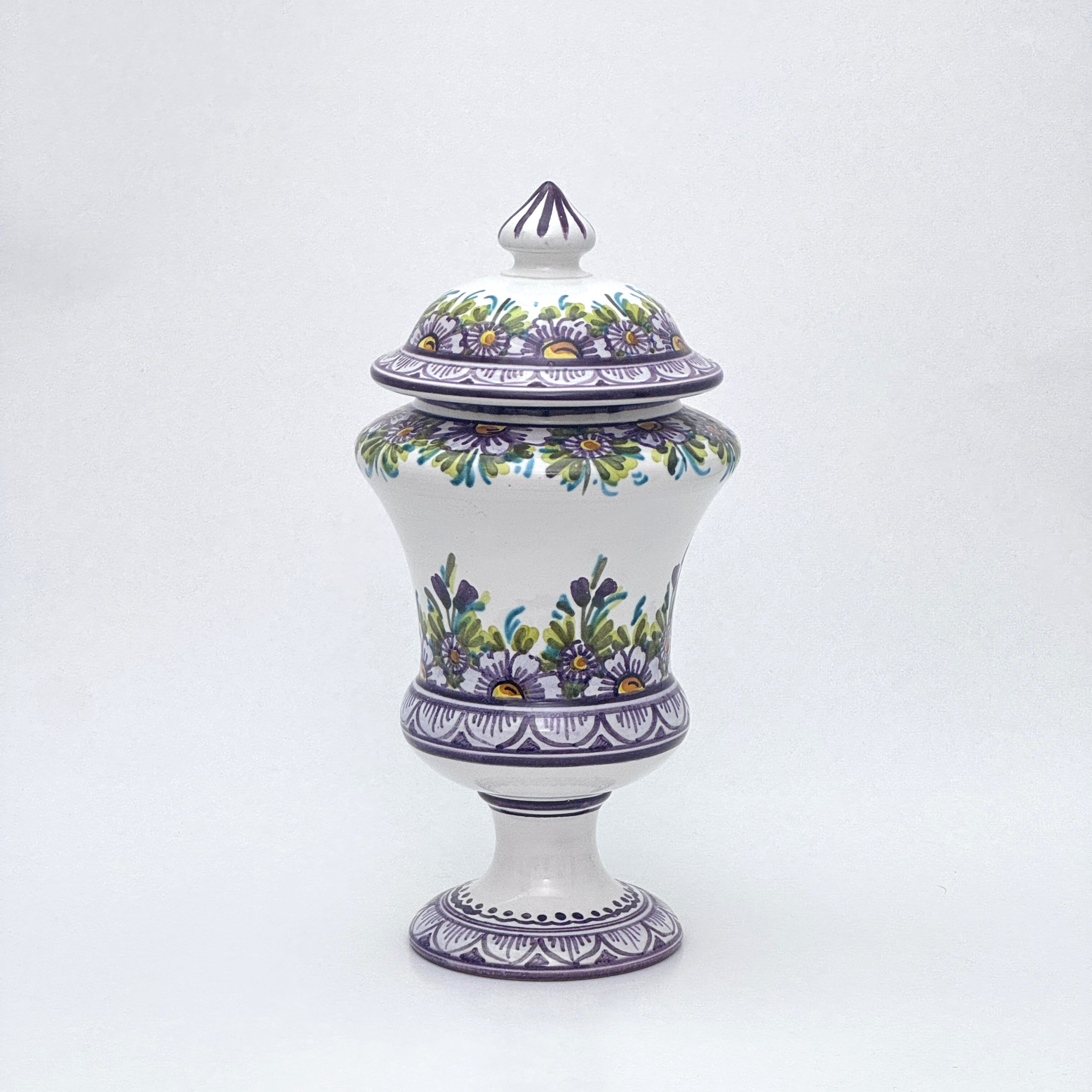 Il vaso dalla forma sinuosa  foggiato a mano riprende le linee degli antichi vasi per le spezie dei farmacisti. La decorazione accurata sulla superficie curva rende l’oggetto speciale.
