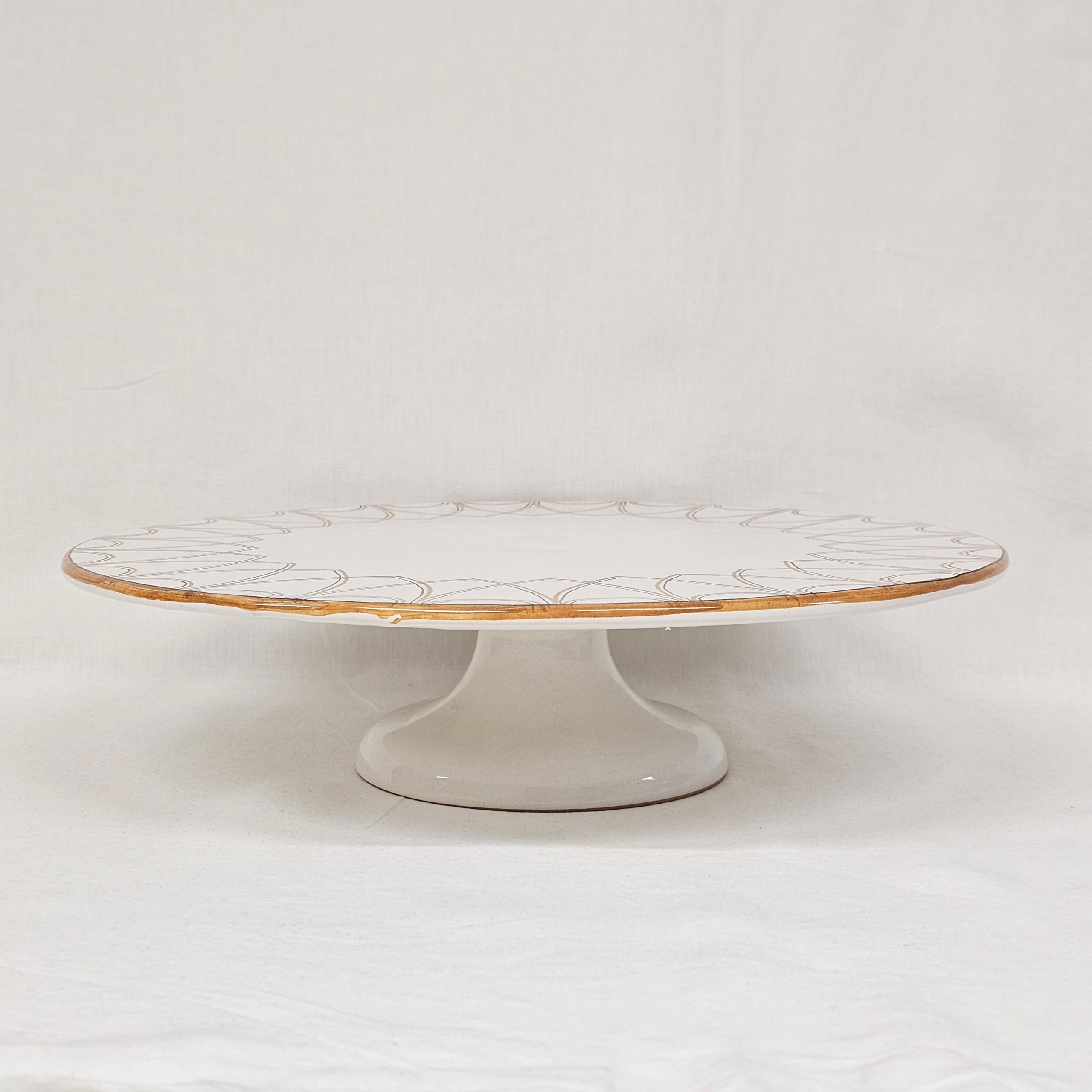L’alzata con piede sottile e centrale diventa la protagonista della tavola per servire torte dolci, salate, composizioni di frutta e dolci e può dare spazio alla creativitĂ . In smalto bianco avorio con una fascia decorata in arancio Castelli e manganese, colori tipici della tavolozza castellana.
