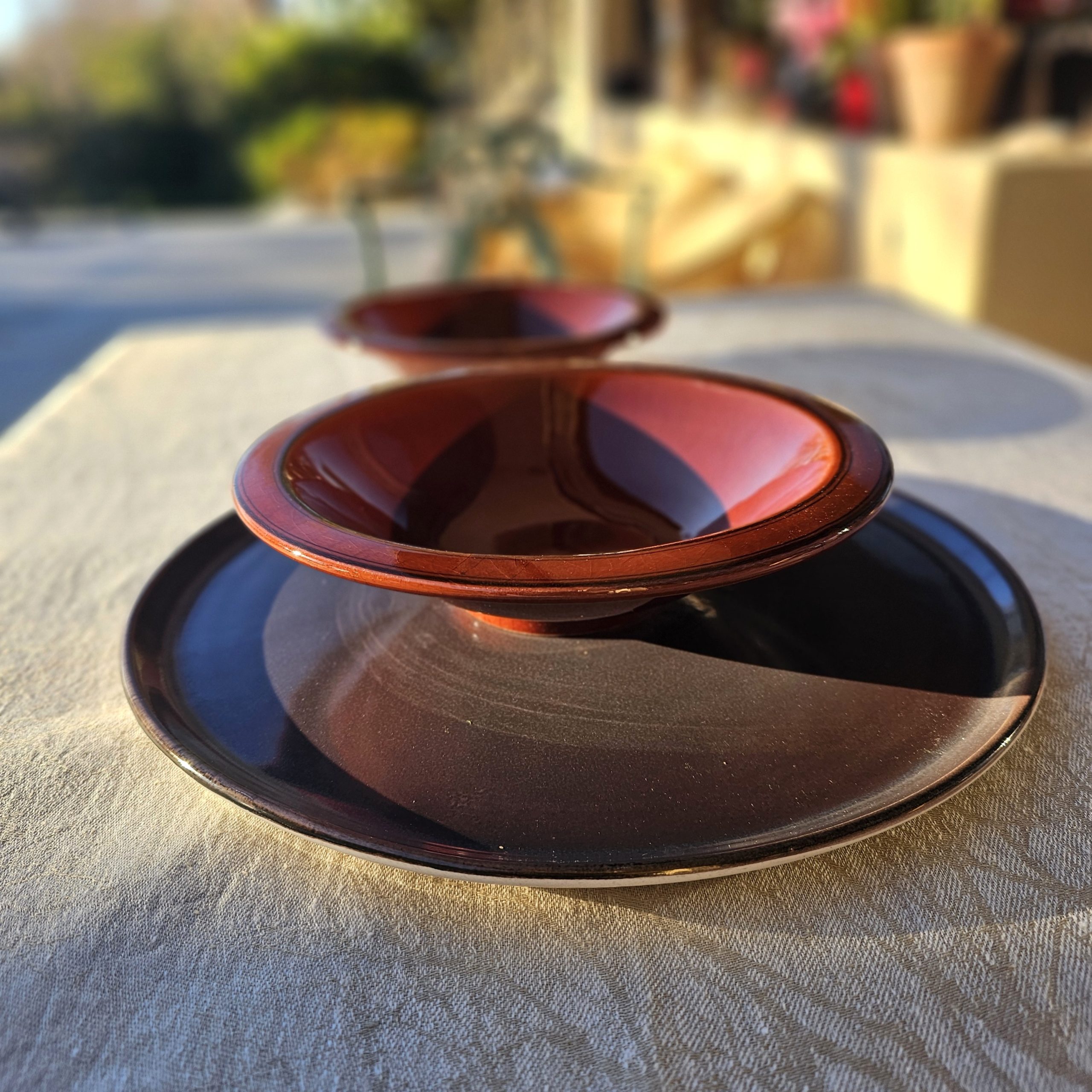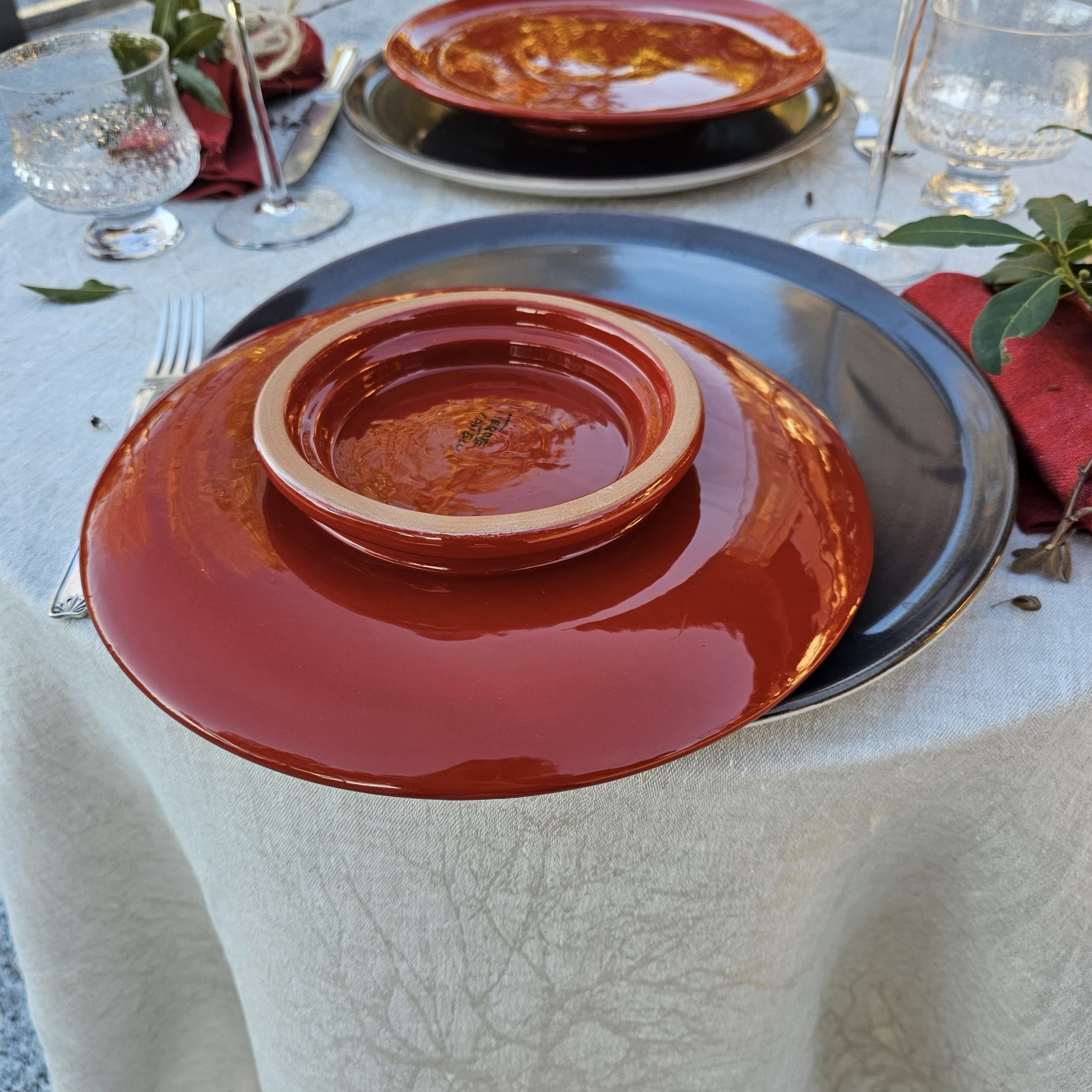 Il piatto ha una superficie piatta con un leggero bordo laterale che lo rende ideale per servire torte , dolci o salate, per fungere da sottopiatto o anche come piatto pizza. La colorazione in manganese, colore fra il cioccolato scuro nel caso dei piatti proposti è meno scuro perchè realizzato con la tecnica a spruzzo che rende il colore meno forte ma che crea degli effetti diversi su ogni piatto. Lo spruzzo del colore viene fatto solo sulla superficie più a vista mentre il fondo rimande del color avorio dello smalto di base. Ideale per essere chi ama lasciarsi stupire dagli effetti singolari che si sviluppano in cottura e che non vengono considerati dei difetti ma delle caratteristiche del fatto a mano.