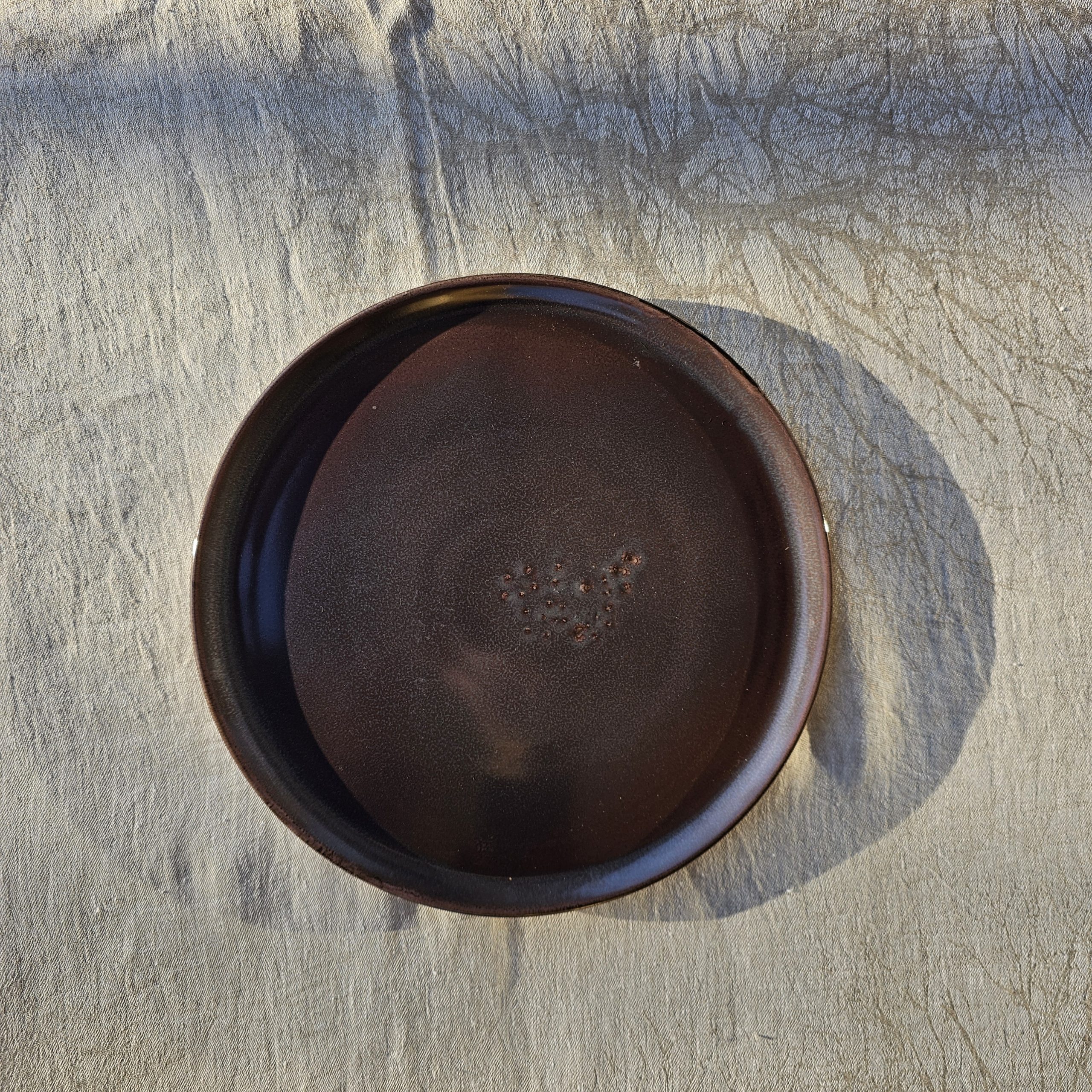 Piatto piano in color manganese spruzzato.