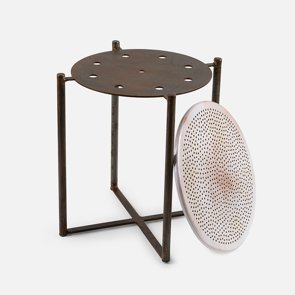 Tavolino basso composto da un disco in ceramica con fori piccoli in smalto color avorio decorato con uno spruzzo in color caffè . La struttura su cui è appoggiato il disco in ceramica è in ferro dal color marrone scuro irregolare ottenuto facendo ossidare il ferro della struttura. Un fissativo opaco interrompe il naturale processo di ossidazione che conferisce al tavolo il suo affascinante color caffè.